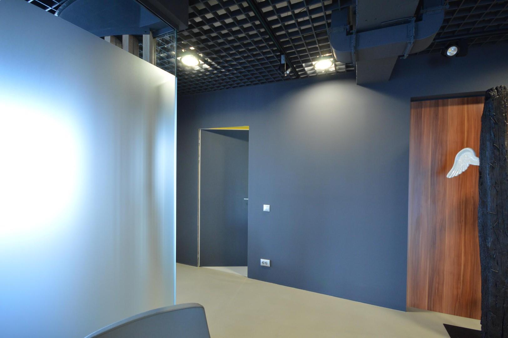 Pentru aceasta amenajare de birouri au fost folosite usi filomuro A si usi tip B. Tocurile sunt de aluminiu, balamalele sunt ascunse iar brosca este magnetica. Cererea initiala a clientului a fost ca foile de usa sa fie la exterior vopsite in aceeasi culoare RAL cu peretii iar la interior sa fie albe. Din acest motiv au fost comandate foi de usa nefinisate, predispuse vopsirii cu lavabila.